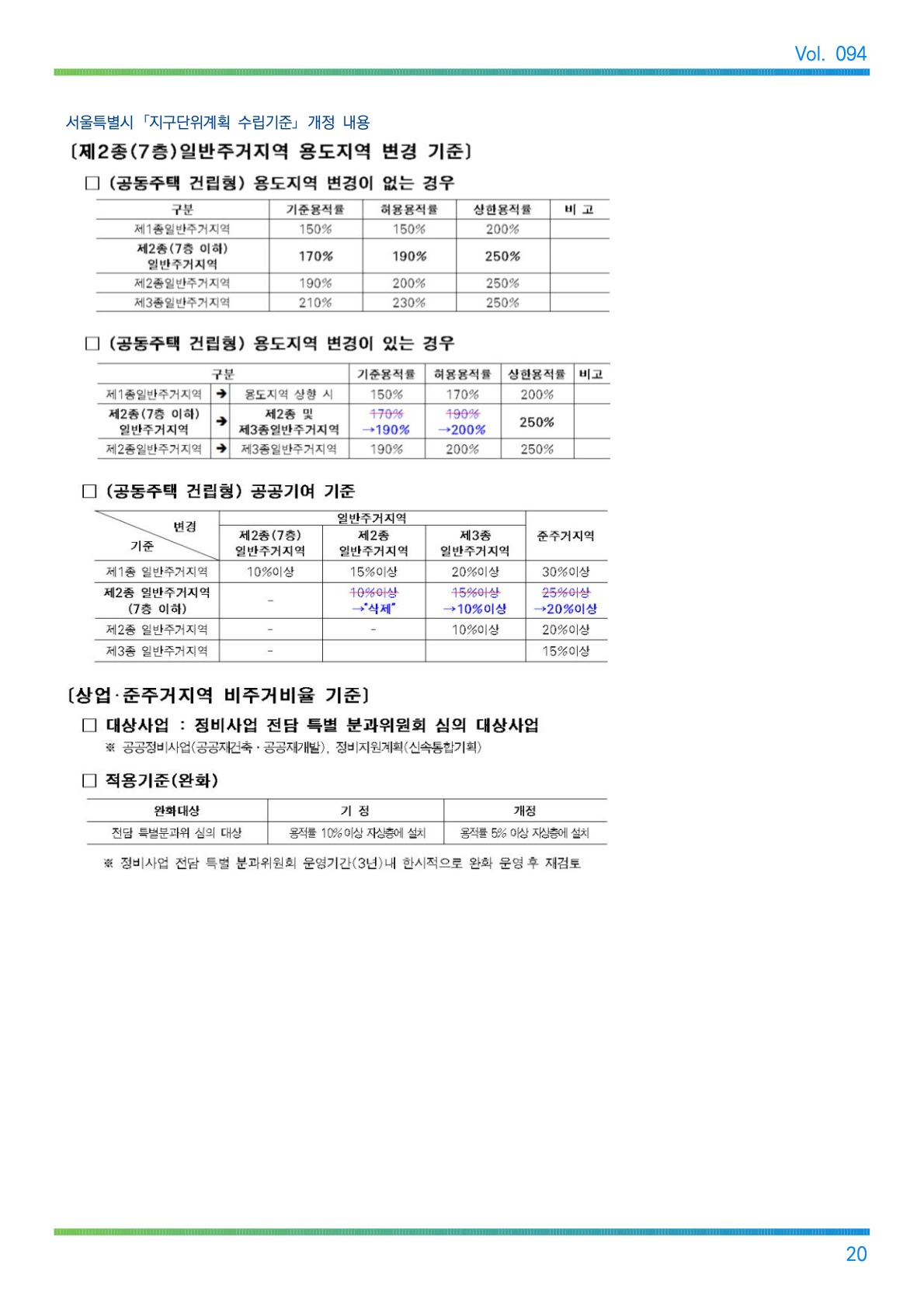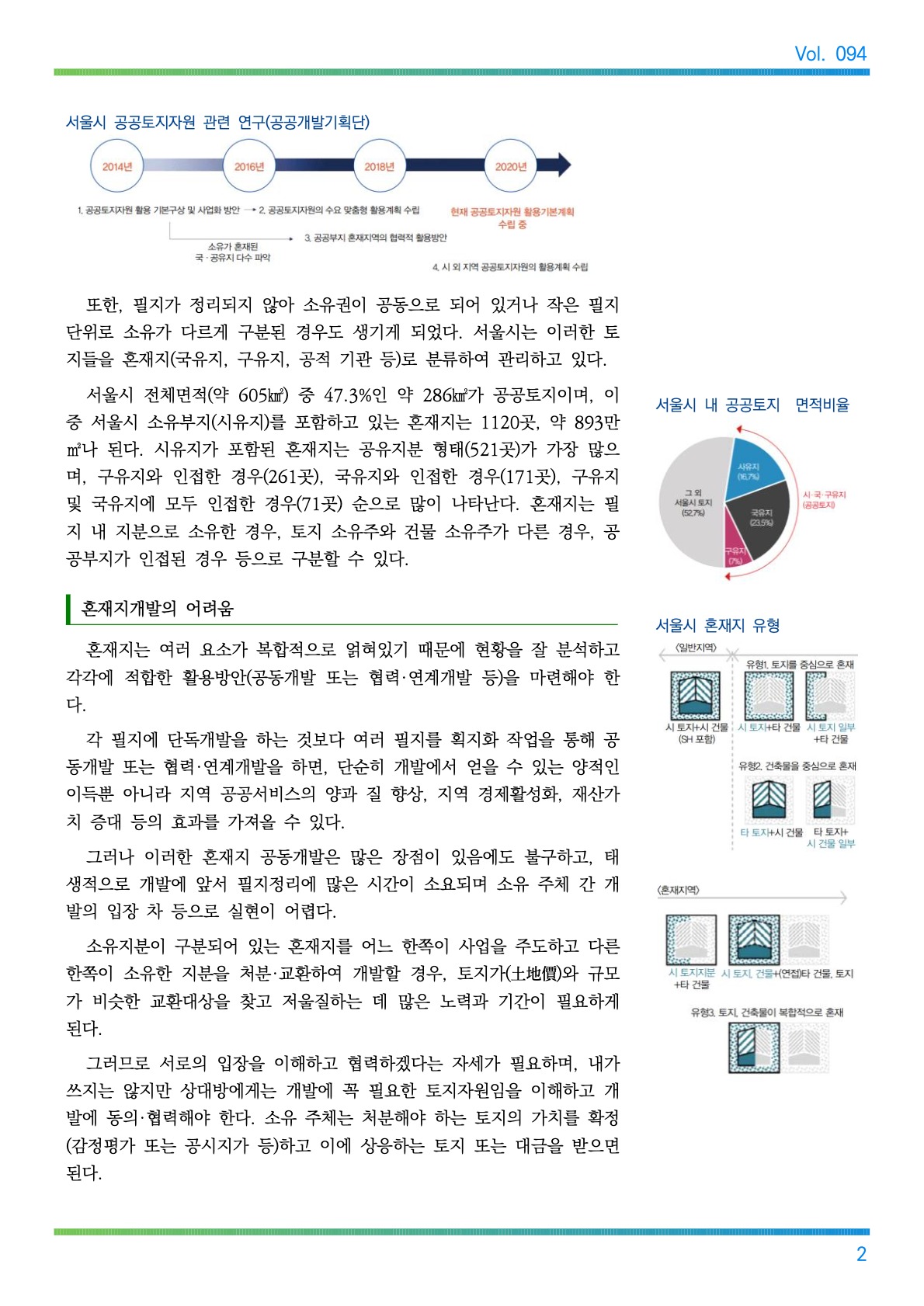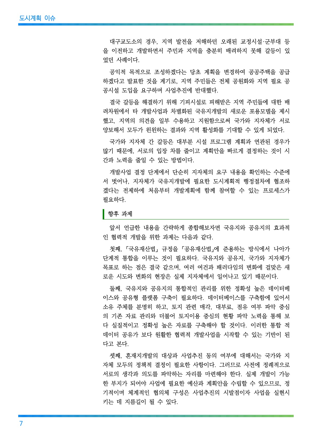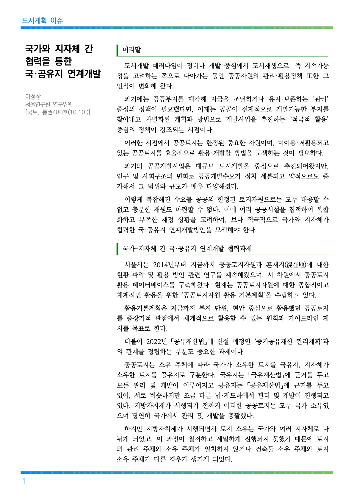 094 2021년 11월호 도시계획 CONTENTS 도시계획 이슈 국제 동향 국내 동향 도시계획 이모저모 지역 동정 청렴 소식 국가와 지자체 간 협력을 통한 국·공유지 연계개발 01 일본의 국유지 관리 및 활용전략 09 미국의 국유지 관리 현황과 정책 13 정책 동향 16 법령 동향 21 신천의 교량(橋梁), 어디까지 아는교?(2부) 22 도시계획 이야기 도시계획위원회 심의 결과 도시계획 관련 고시・공고 이달의 청렴 이야기 알리는 글 26 28 28 29 29 대구광역시 도시계획과 도시계획상임기획단 NEWS NEWS 도시계획 이슈 국가와 지자체 간 머리말 협력을 통한 국·공유지 연계개발 이성창 서울연구원 연구위원 [국토, 통권480호(10.10.)] 도시개발 패러다임이 정비나 개발 중심에서 도시재생으로, 즉 지속가능 성을 고려하는 쪽으로 나아가는 동안 공공자원의 관리·활용정책 또한 그 인식이 변화해 왔다. 과거에는 공공부지를 매각해 자금을 조달하거나 유지·보존하는 ‘관리’ 중심의 정책이 필요했다면, 이제는 공공이 선제적으로 개발가능한 부지를 찾아내고 차별화된 계획과 방법으로 개발사업을 추진하는 ‘적극적 활용’ 중심의 정책이 강조되는 시점이다. 이러한 시점에서 공공토지는 한정된 중요한 자원이며, 미이용·저활용되고 있는 공공토지를 효율적으로 활용·개발할 방법을 모색하는 것이 필요하다. 과거의 공공개발사업은 대규모 도시개발을 중심으로 추진되어왔지만, 인구 및 사회구조의 변화로 공공개발수요가 점차 세분되고 양적으로도 증 가해서 그 범위와 규모가 매우 다양해졌다. 이렇게 복잡해진 수요를 공공의 한정된 토지자원으로는 모두 대응할 수 없고 충분한 재원도 마련할 수 없다. 이에 여러 공공시설을 집적하여 복합 화하고 부족한 재정 상황을 고려하여, 보다 적극적으로 국가와 지자체가 협력한 국·공유지 연계개발방안을 모색해야 한다. 국가-지자체 간 국·공유지 연계개발 협력과제 서울시는 2014년부터 지금까지 공공토지자원과 혼재지(混在地)에 대한 현황 파악 및 활용 방안 관련 연구를 계속해왔으며, 시 차원에서 공공토지 활용 데이터베이스를 구축해왔다. 현재는 공공토지자원에 대한 종합적이고 체계적인 활용을 위한 ‘공공토지자원 활용 기본계획’을 수립하고 있다. 활용기본계획은 지금까지 부지 단위, 현안 중심으로 활용했던 공공토지 를 중장기적 관점에서 체계적으로 활용할 수 있는 원칙과 가이드라인 제 시를 목표로 한다. 더불어 2022년 「공유재산법」에 신설 예정인 ‘중기공유재산 관리계획’과 의 관계를 정립하는 부분도 중요한 과제이다. 공공토지는 소유 주체에 따라 국가가 소유한 토지를 국유지, 지자체가 소유한 토지를 공유지로 구분한다. 국유지는 「국유재산법」에 근거를 두고 모든 관리 및 개발이 이루어지고 공유지는 「공유재산법」에 근거를 두고 있어, 서로 비슷하지만 조금 다른 법·제도하에서 관리 및 개발이 진행되고 있다. 지방자치제가 시행되기 전까지 이러한 공공토지는 모두 국가 소유였 으며 당연히 국가에서 관리 및 개발을 총괄했다. 하지만 지방자치제가 시행되면서 토지 소유는 국가와 여러 지자체로 나 뉘게 되었고, 이 과정이 철저하고 세밀하게 진행되지 못했기 때문에 토지 의 관리 주체와 소유 주체가 일치하지 않거나 건축물 소유 주체와 토지 소유 주체가 다른 경우가 생기게 되었다. 1 서울시 공공토지자원 관련 연구(공공개발기획단) Vol. 094 또한, 필지가 정리되지 않아 소유권이 공동으로 되어 있거나 작은 필지 단위로 소유가 다르게 구분된 경우도 생기게 되었다. 서울시는 이러한 토 지들을 혼재지(국유지, 구유지, 공적 기관 등)로 분류하여 관리하고 있다. 서울시 전체면적(약 605km²) 중 47.3%인 약 286km²가 공공토지이며, 이 중 서울시 소유부지(시유지)를 포함하고 있는 혼재지는 1120곳, 약 893만 m²나 된다. 시유지가 포함된 혼재지는 공유지분 형태(521곳)가 가장 많으 며, 구유지와 인접한 경우(261곳), 국유지와 인접한 경우(171곳), 구유지 및 국유지에 모두 인접한 경우(71곳) 순으로 많이 나타난다. 혼재지는 필 지 내 지분으로 소유한 경우, 토지 소유주와 건물 소유주가 다른 경우, 공 공부지가 인접된 경우 등으로 구분할 수 있다. 혼재지개발의 어려움 혼재지는 여러 요소가 복합적으로 얽혀있기 때문에 현황을 잘 분석하고 각각에 적합한 활용방안(공동개발 또는 협력·연계개발 등)을 마련해야 한 다. 각 필지에 단독개발을 하는 것보다 여러 필지를 획지화 작업을 통해 공 동개발 또는 협력·연계개발을 하면, 단순히 개발에서 얻을 수 있는 양적인 이득뿐 아니라 지역 공공서비스의 양과 질 향상, 지역 경제활성화, 재산가 치 증대 등의 효과를 가져올 수 있다. 그러나 이러한 혼재지 공동개발은 많은 장점이 있음에도 불구하고, 태 생적으로 개발에 앞서 필지정리에 많은 시간이 소요되며 소유 주체 간 개 발의 입장 차 등으로 실현이 어렵다. 소유지분이 구분되어 있는 혼재지를 어느 한쪽이 사업을 주도하고 다른 한쪽이 소유한 지분을 처분·교환하여 개발할 경우, 토지가(土地價)와 규모 가 비슷한 교환대상을 찾고 저울질하는 데 많은 노력과 기간이